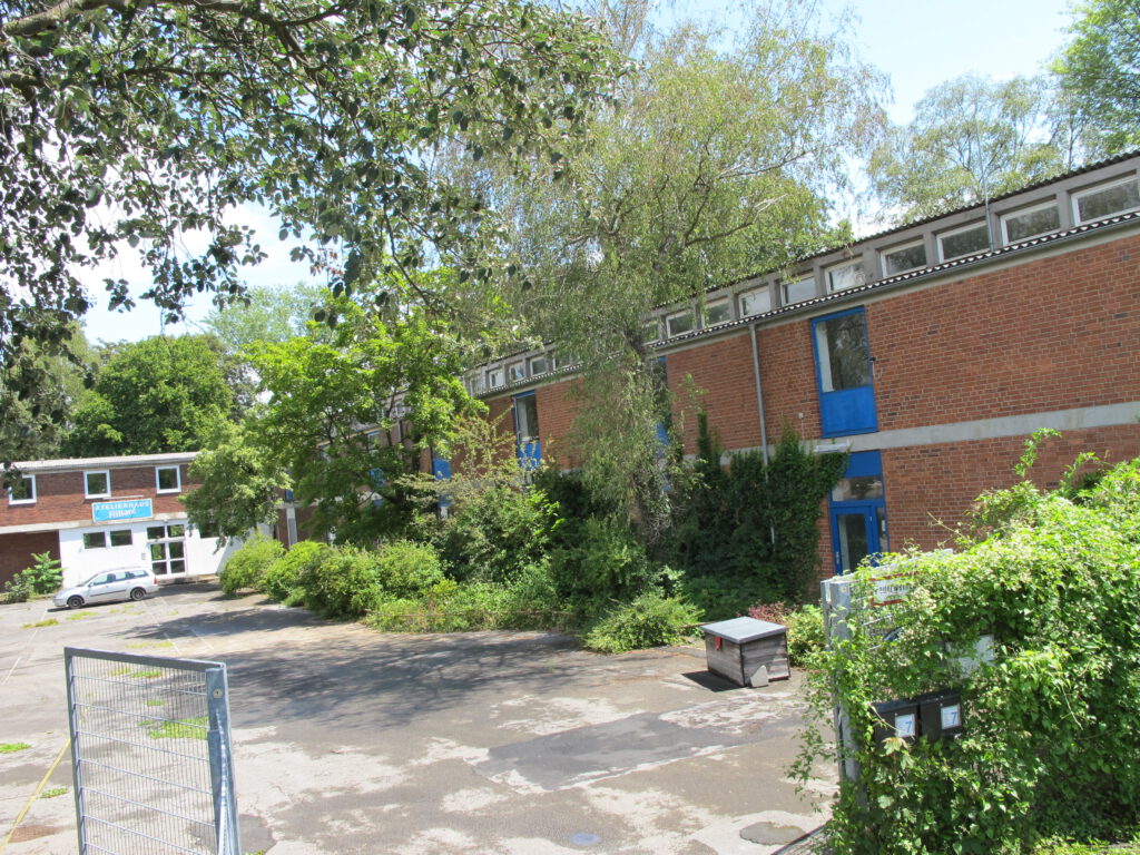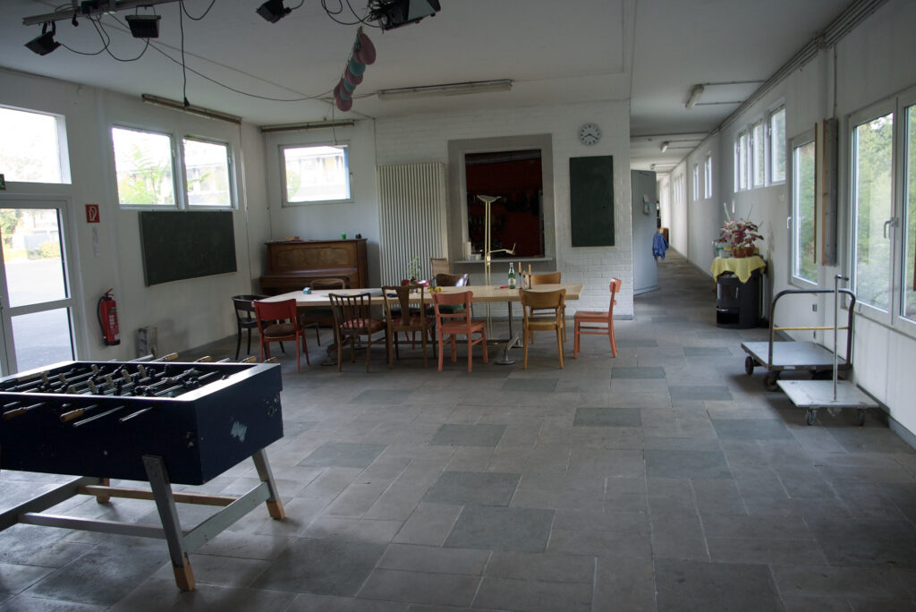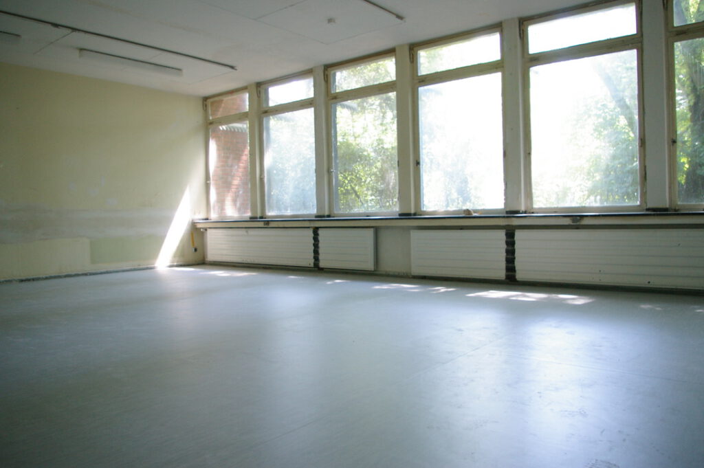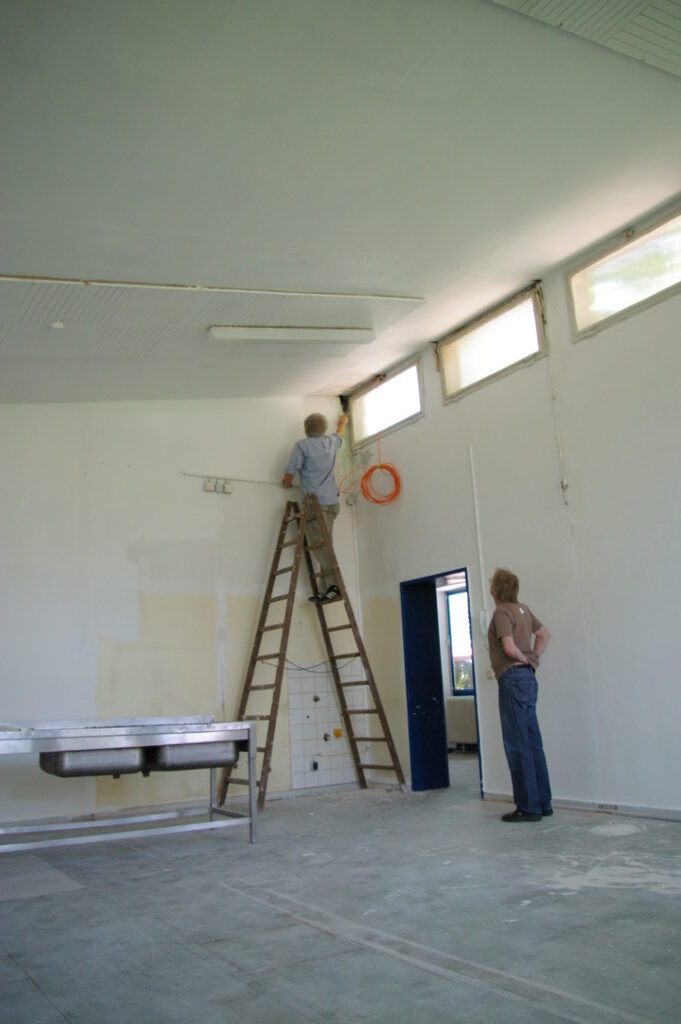 Einmal abgesehen von all den baulichen Schwierigkeiten und der Grenzlage zu Leverkusen sah das Haus wirklich übel aus. Kaum vorstellbar für die Mehrheit der Künstler, dass man daraus ein Atelierhaus bauen könnte. Das Land NRW hatte die Klassenräume mit billigsten Mitteln und lieblos eingezogenen Leichtbauwänden in kleine Mehrbettzellen zerstückelt, um möglichst vielen Asylanten Platz zu schaffen. Als das Gebäude später nicht mehr gebraucht wurde, hat sie es einfach liegen gelassen. Besonders die Jungen nutzten das Areal zunehmend als Abenteuerspielplatz und Kampfarena. Eingeschlagene Scheiben, leergespritzte Feuerlöscher, zerstörte Wände, heruntergerissene Raufaser, verbranntes Inventar. Als wir das Gelände besichtigten, sah es aus wie nach einem Abrissversuch.